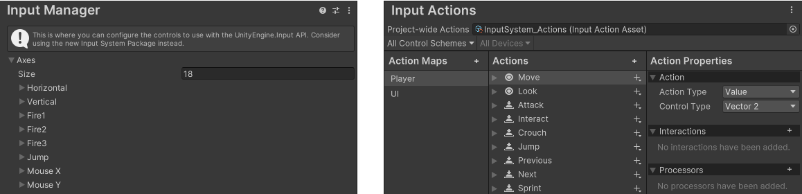 _On the left, the old Input Manager Axes Configuration window, in Project settings. On the right, the new Input System's [Actions Editor](ActionsEditor.md)._