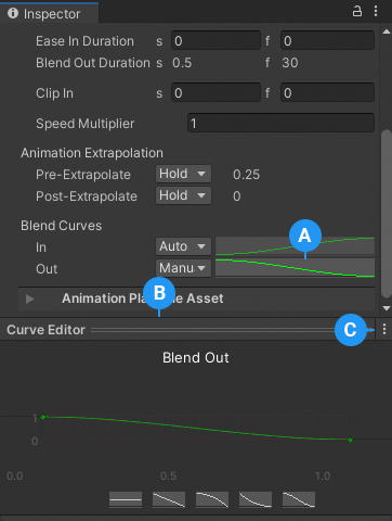 To customize either the Blend Out curve or Blend In curve, use the drop-down menu to switch from **Auto** to **Manual**. With **Manual** selected, the Inspector window displays a preview of the blend curve. Click the Curve Preview to open the Curve Editor in the Inspector window.