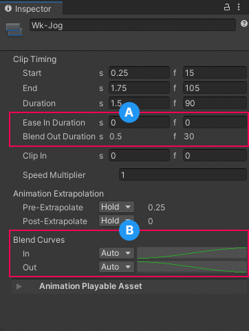 In the Inspector window, the label for the **Ease In Duration** or **Ease Out Duration** property changes to **Blend In Duration** or **Blend Out Duration** if either affects a blend. The blend duration properties cannot be edited when labelled **Blend In Duration** or **Blend Out Duration** because the duration of the blend area is only editable in the Content view.