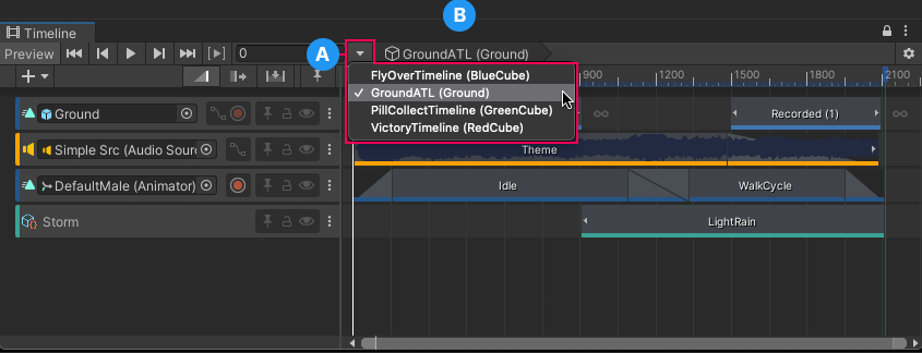 Each menu item and the Timeline title displays the name of the Timeline asset and its associated GameObject in the current Scene. For example, the Timeline asset named `GroundATL` is associated with the `Ground` GameObject. In this case, the Timeline title displays `GroundATL (Ground)`.