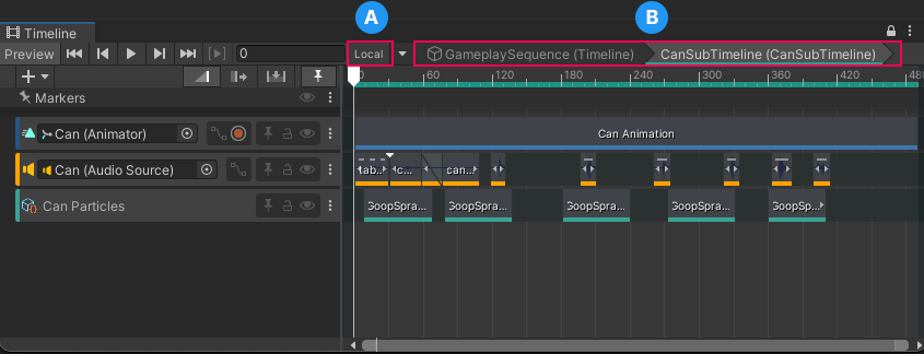 When you are editing a Sub-Timeline instance, the Timeline title displays a breadcrumb list of Timeline and Sub-Timeline instances. The **Local** or **Global** button indicates whether the Timeline ruler displays local time or global time.