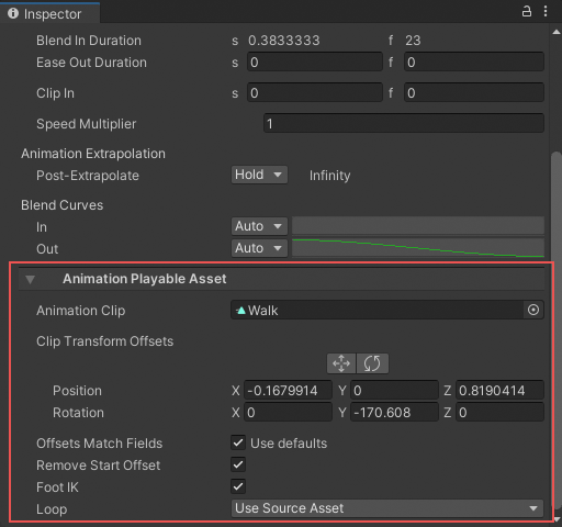 1. Select the Animation clip in the Timeline window and, in the Inspector window, expand **Animation Playable Asset**.