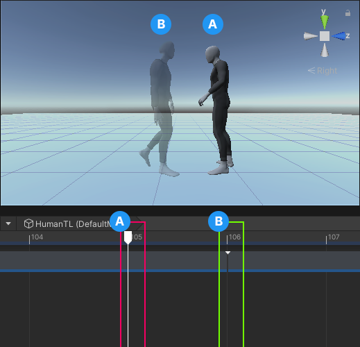 _The `DefaultMale` jumps between the `TurnLeft` Animation clip, which ends at frame 105 (A), and the `Walk` Animation clip, ghost model which starts at frame 106 (B)_