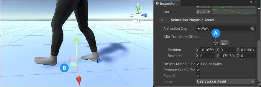 In this example, the X Position. Z Position, and Y Rotation of the **Clip Transform Offsets** for the Walk Animation clip is not zero because a **Match Offsets to Previous Clip** was performed earlier in this workflow. Match to a previous clip sets these values to match the root of the humanoid at the end of the previous Animation clip.