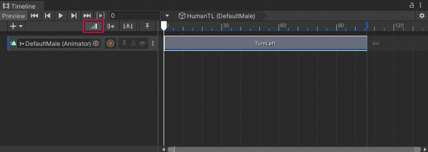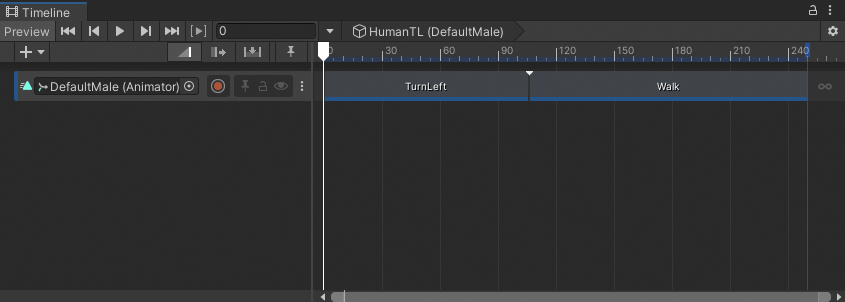 1. Play the Timeline instance. In this example, the `DefaultMale` animation jumps between each Animation clip because its position and rotation at the end of each clip does not match the position and rotation at the start of the next Animation clip.