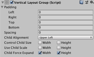 |**Child Force Expand** |Whether to force the child layout elements to expand to fill additional available space. |